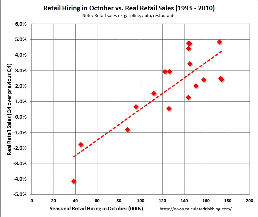 The scatter graph is for the years 1993 through 2010 and compares October retail hiring with the real increase (inflation adjusted) for retail sales (Q4 over previous Q4).In general October hiring is a pretty good indicator of seasonal sales. R-square is 0.69 for this small sample. Note: This uses retail sales in Q4, and excludes autos, gasoline and restaurants.