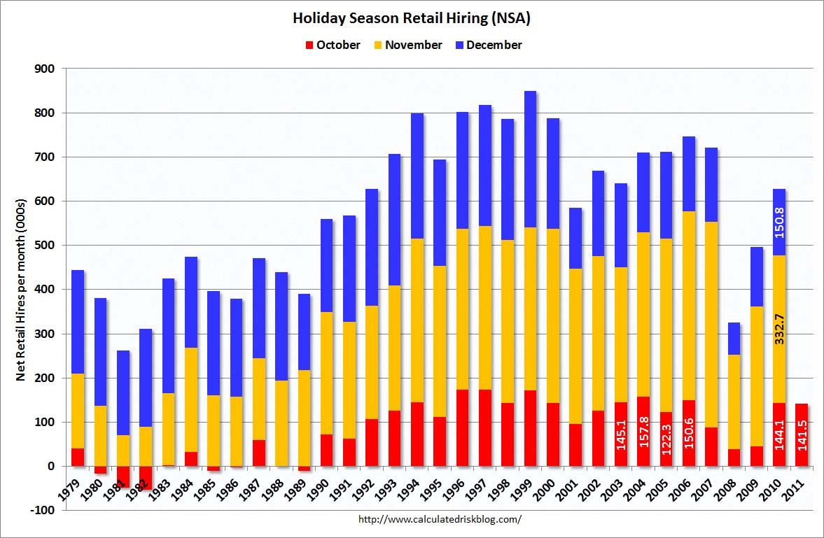 The 2011 holiday season can be summed up in one word: average. On the heels of a holiday season that outperformed most analysts’ expectations, holiday retail sales for 2011 are expected to increase 2.8 percent to $465.6 billion, according to the National Retail Federation. While that growth is far lower than the 5.2 percent increase retailers experienced last year, it is slightly higher than the ten-year average holiday sales increase of 2.6 percent.Here is a repeat of the graph of retail hiring based on the BLS employment report: